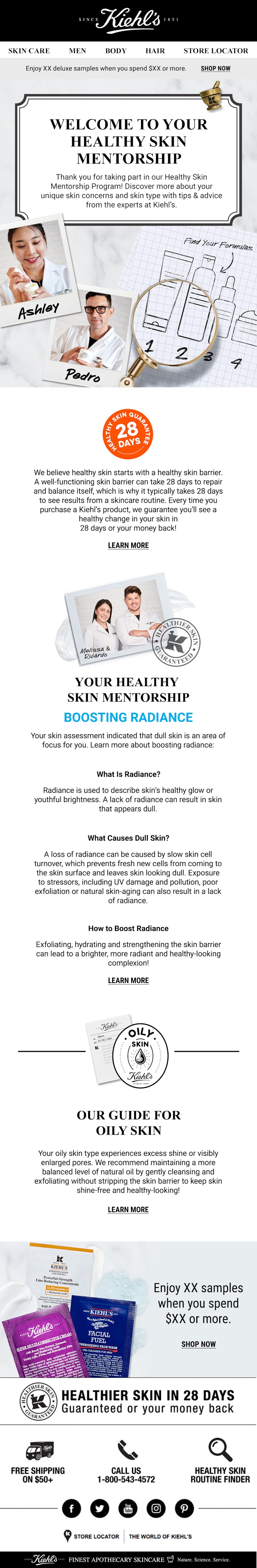 These educational emails are triggered by when consumers take our Healthy Skin Routine Finder or visit a Kiehl's store to learn more about our 28-day Healthy Skin Guarantee. Each email is tailored to a specific skin type and skin concern as a personalized approach to discovering healthy skin!